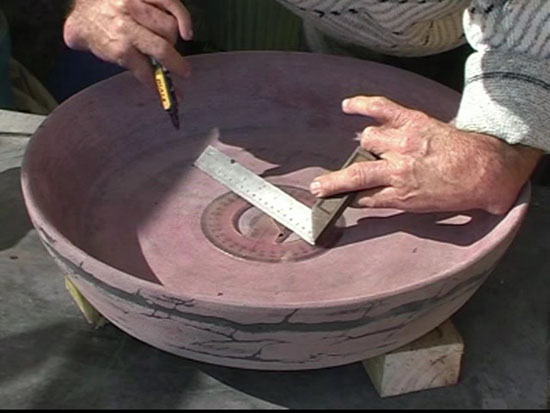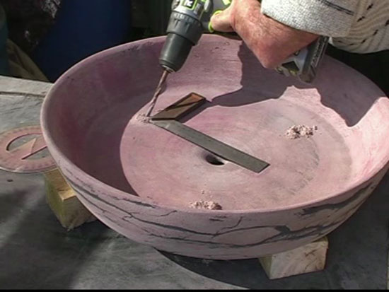 Next morning remove the sand pit around the dish. Remember to avoid contaminating the sand pit sand with concrete lumps of any kind.... The new layer can now be surface carved to an even, smooth finish. The water inlet hose can be removed and the cork can also be carefully extracted by drilling it's centre away then pushing the thin shell left through from the top side.