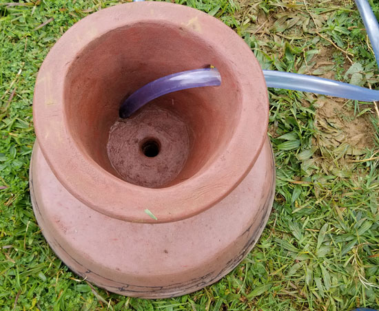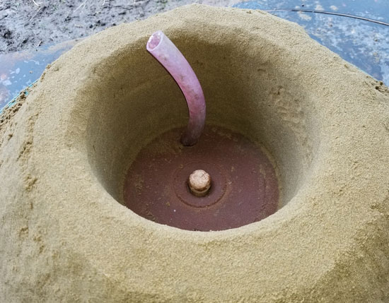 A cork is used at the dish centre to preserve the drain of the dish and a short length of supply hose is also inserted into the ring of sand. Please note that this hose is slanted in the same direction as the inlet holes in the dish below..