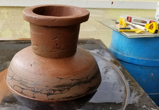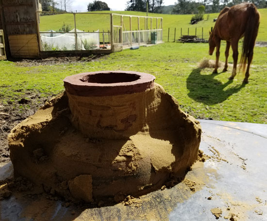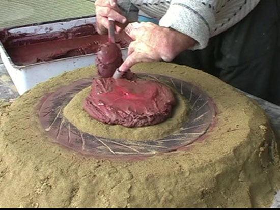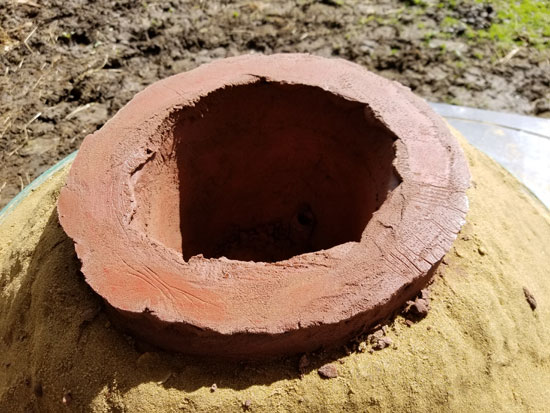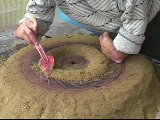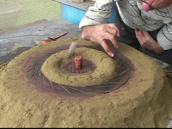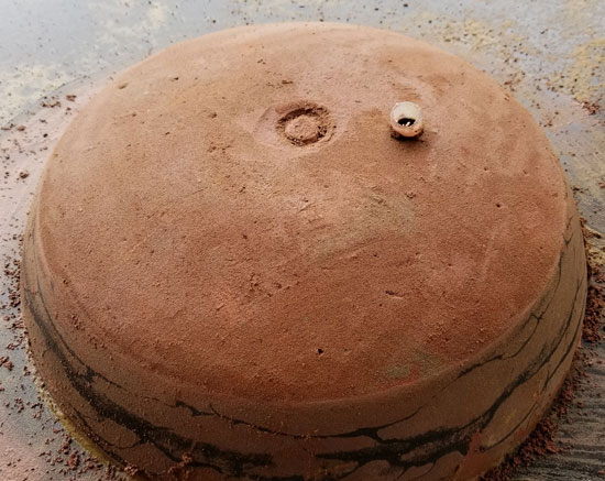 A ring of sand is now formed onto the dish. This sand ring makes what will become the water channel that joins the water supply hose to the three inlet holes.