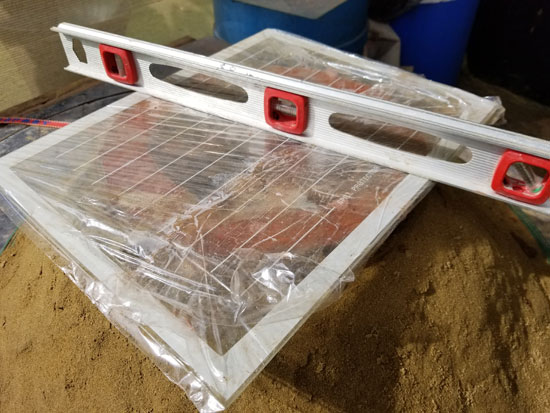 A square of glass wrapped once with cling film is placed on top and lightly wriggled down flat. Have a level there to assist with getting this face true. It needs to be as level as you can make it. Leave it in position and let set over night.