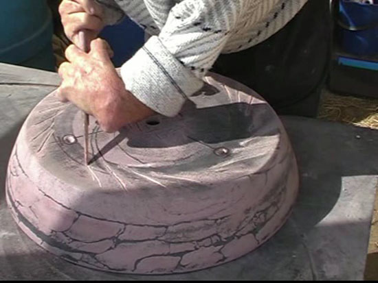 Next we score the underside of the dish where new concrete is going to be. This scoring helps to key on the new material.