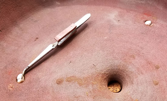 The cotton wool plugs can now be removed as well as the remaining shell of cork. We also need to get the ring of sand out so that the water channel is clear. Turn the dish upside down and squirt (jet setting) water into the water supply hole. Sand will back flush and clear the channel way. When water is flowing freely through the 3 outlet holes this task is done. If there is a clog, a flexible wire can be prodded into the blockage to free it...