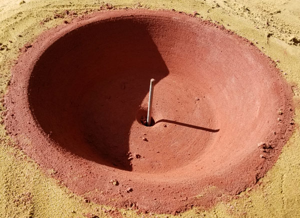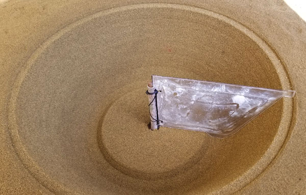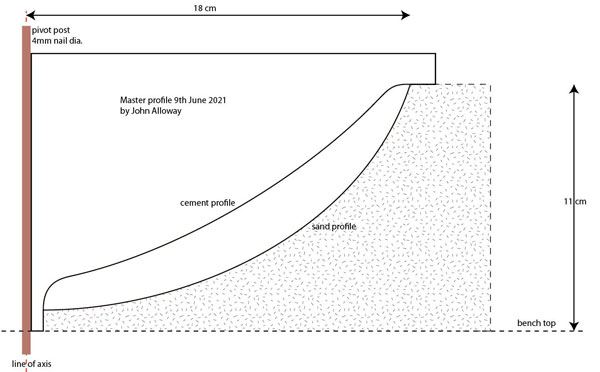 These are simple lathing profiles that are guides / cutters for the green sand molds and the concrete impressions we cast into said molds. As you can see from photos above , these are swung around vertical posts which are secured accurately onto the sand pit floor. |