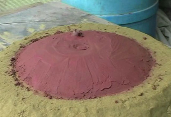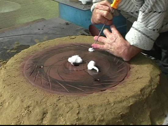 A ring of sand is now formed onto the dish. This sand ring makes what will become the water channel that joins the water supply hose to the three inlet holes.